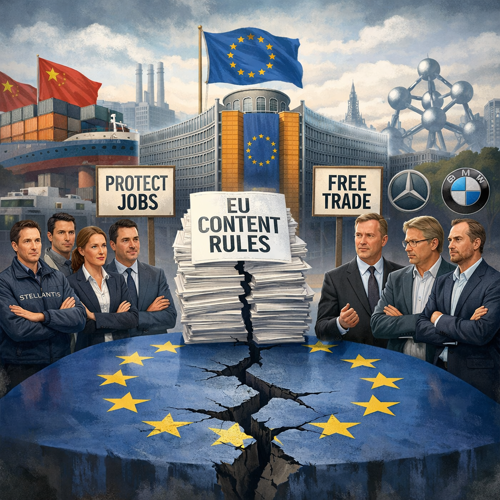 Brussels weighs minimum EU content rules to counter Chinese imports. France and suppliers push for up to 75% local content, while premium German brands warn of rigidity. Disputes persist over calculation methods and the need for matching industrial incentives.