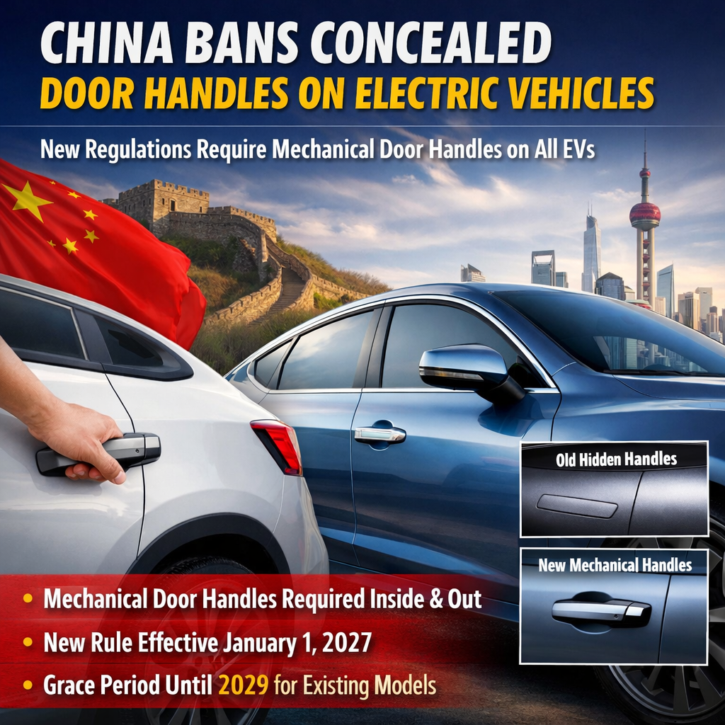China will require mechanical interior and exterior door releases on all EVs from 2027, targeting flush electric handles after fatal crashes. The rule affects most leading EV models, raises redesign costs, and signals China’s growing influence as a global automotive safety rule-setter.