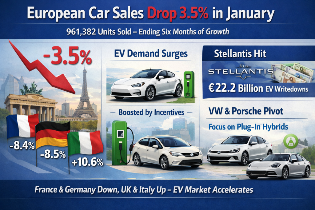 European car sales (source ACEA) fell 3.5% in January to 961,382 units, ending six months of growth as weakness in France and Germany offset gains in the UK and Italy. EV demand rose strongly, supported by incentives, while Stellantis announced €22.2 billion in EV-related writedowns and VW and Porsche pivoted toward plug-in hybrids.