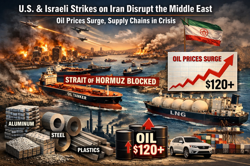 Strikes on Iran lifted oil prices and effectively stopped Hormuz traffic, threatening shipments of LNG and key auto inputs (aluminum, steel feedstocks, plastics). Prolonged disruption could squeeze supply chains in Asia/Europe, raise fuel and vehicle costs, force rerouting, and hit demand; forecasts warn of $100+ oil.