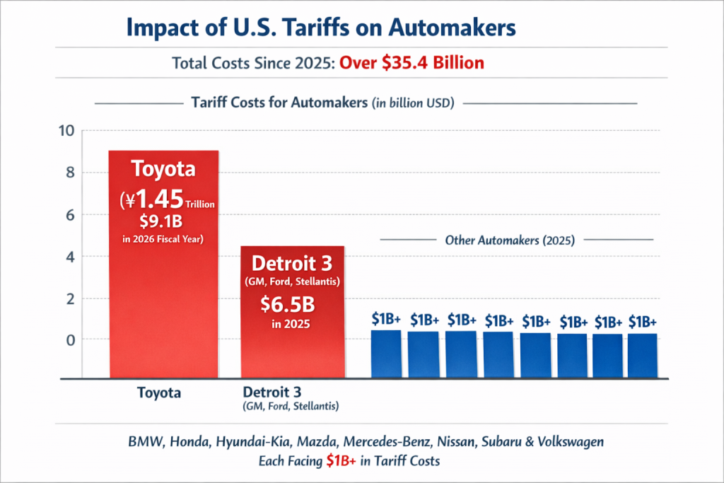 U.S. tariffs have cost automakers at least $35.4 billion since 2025. Toyota faces the biggest projected hit, while many major manufacturers exceed $1 billion each. Alongside EV restructuring costs, tariffs are squeezing margins, lifting prices, reducing imports and clouding investment plans.