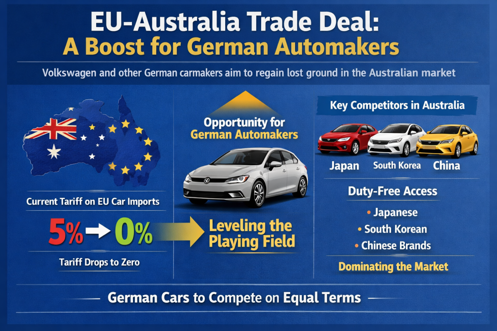The EU-Australia trade agreement would remove Australia’s 5% tariff on EU car imports, putting German brands on the same footing as Japanese, South Korean and Chinese competitors that already enjoy duty-free access. The deal should also ease type-approval procedures and improve conditions for higher-priced electric models, although it is unlikely to take effect before 2027.