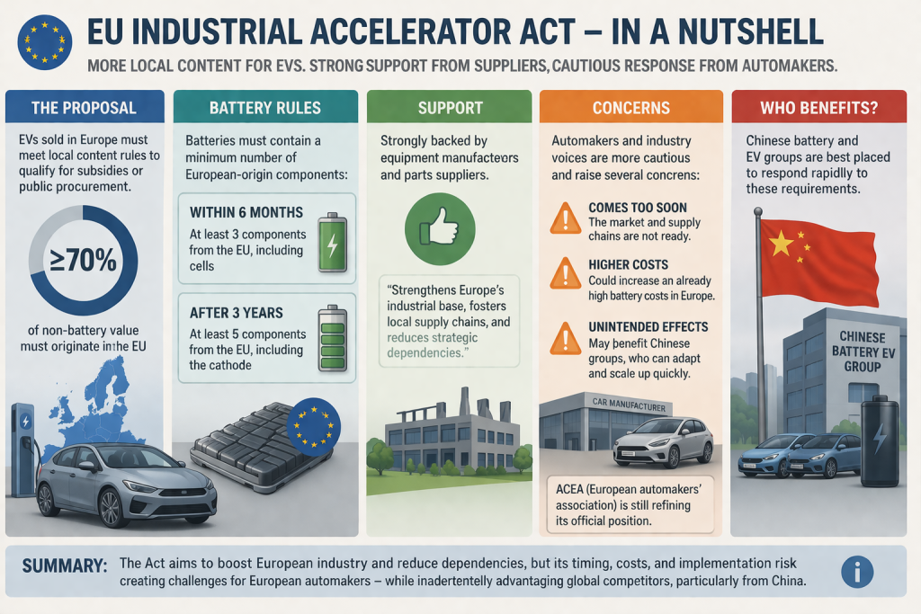 Brussels’ battery local-content plan aims to cut Chinese dependence and boost European production, but automakers warn the timetable is unrealistic, costs could rise, and Chinese suppliers may benefit most because Europe’s battery capacity cannot expand fast enough.