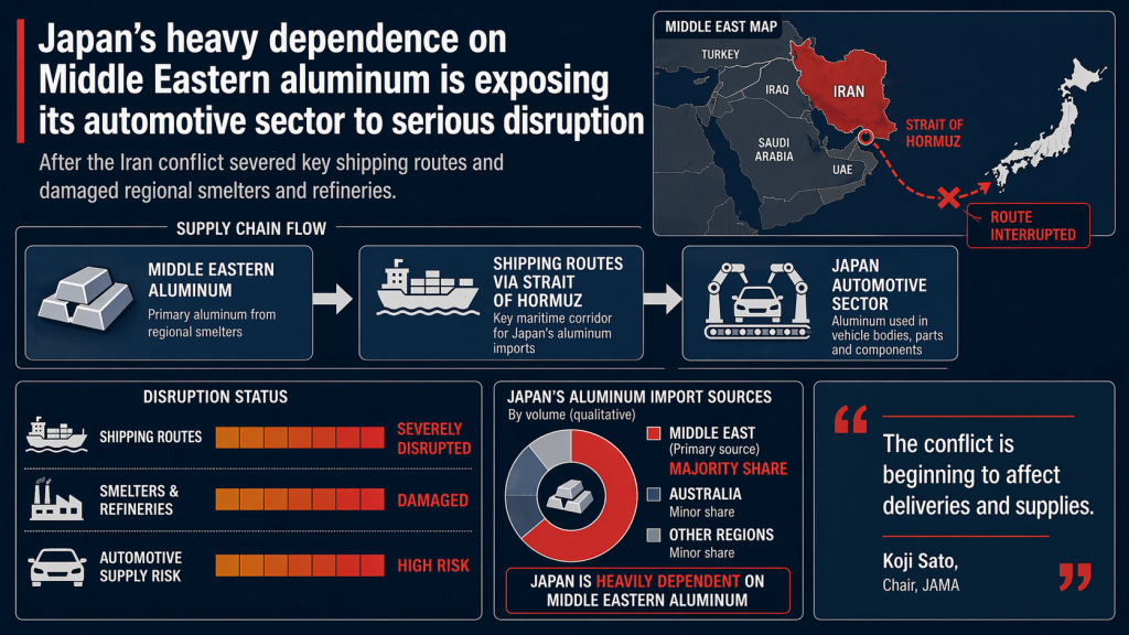 Summary: Japan’s auto sector is highly exposed to the Iran-war aluminum shock: about 70% of automotive aluminum imports come from the Middle East. Prices are up 13%, deliveries have stopped, Denso output is down, and acute shortages could hit by late April or early May.