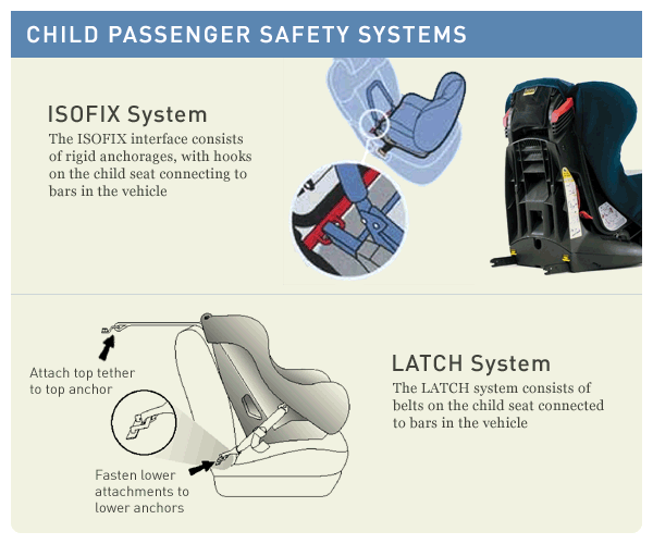 New systems to attach the child safety seat in the vehicle have been developed and are now widely available. These systems provide a standard interface between the child seat and the car seat. This interface consists of rigid anchorages, with hooks on the child seat connecting to bars in the vehicle (ISOFIX system) or flexible, with belts on the child seat connected to the bars in the vehicle (LATCH system)